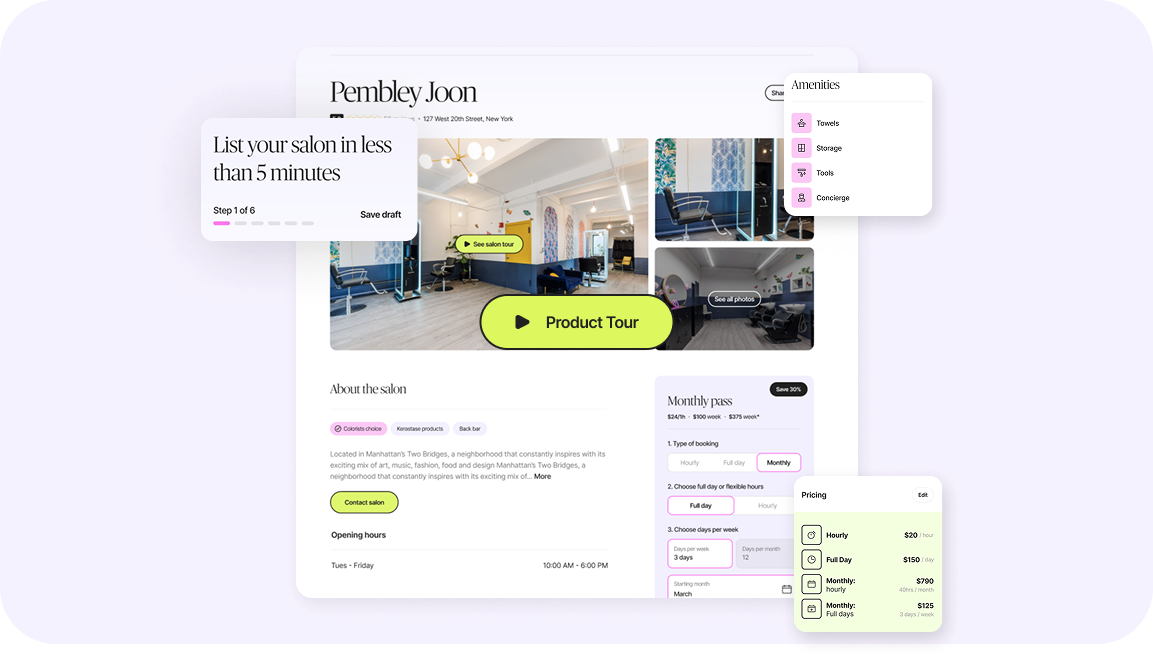 Rent exclusive salon spaces by the hour for your hair salon, nail salon, massage or spa service. See your clients anywhere, anytime. Currently in NYC.